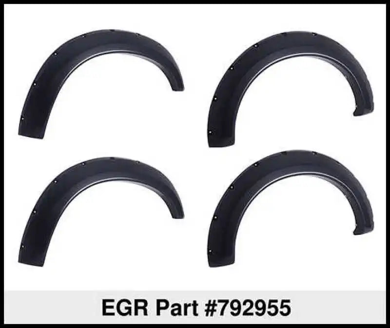 EGR Matte Black Bolt On Look Fender Flares features EGR's OEM grade, no drill installation. EGR Fender Flares are the perfect DIY upgrade for your vehicle. The UV protected, lightly textured matte black finish is easy to clean and fade resistant. EGR Fender Flares can also be easily painted to match your vehicle. Real stainless steel bolts for uncompromising detail. Increase tire coverage of your fenders by up to 2 inches. Limited lifetime warranty. FRONT & REAR SET.