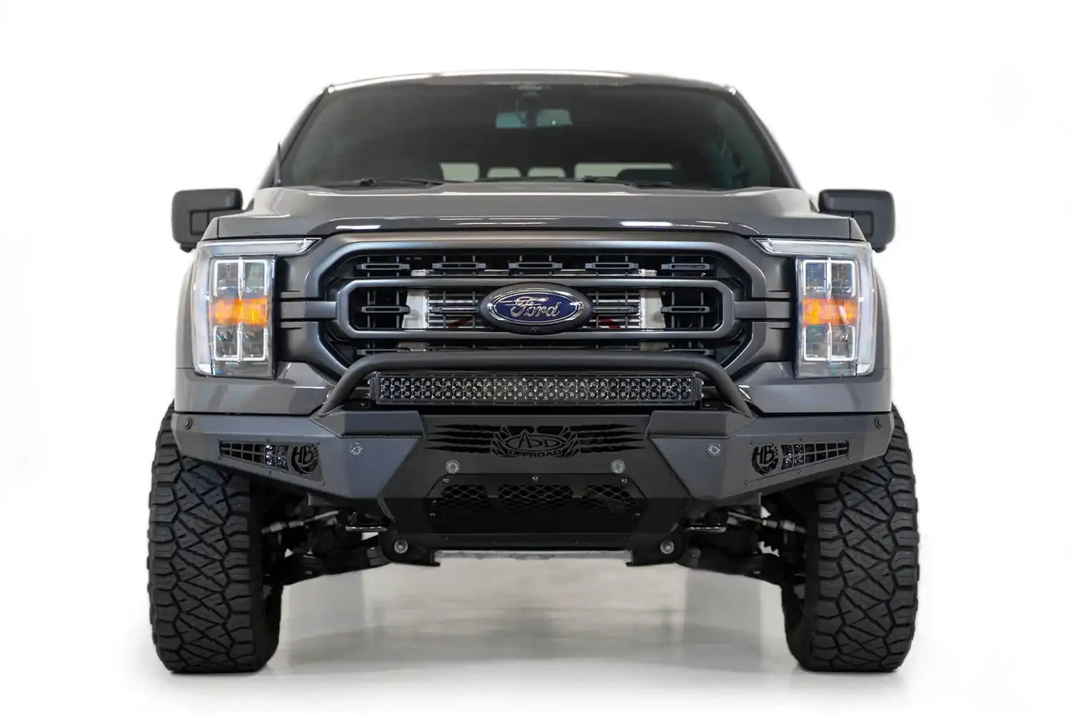 The newly redesigned Addictive Desert Designs HoneyBadger Front Bumper keeps the same rugged styling as the original but with a low-profile fitment. There is an optional top hoop, but either configuration has room to mount a radius 30 Inch light bar on top of the bumper. The center of the bumper houses a straight 20 Inch light bar, and two cube lights can be mounted behind the side panels. The HoneyBadger comes in Hammer Black Powder Coated Finish with satin black panels. OEM amenities, such as parking sensors and tow hooks, are retained. Even though it is an aftermarket front bumper, the HoneyBadger follows the bodylines perfectly, making the front of your Ford F-150 look unique without sacrificing quality. As always this product is fully bolt-on and made in America.