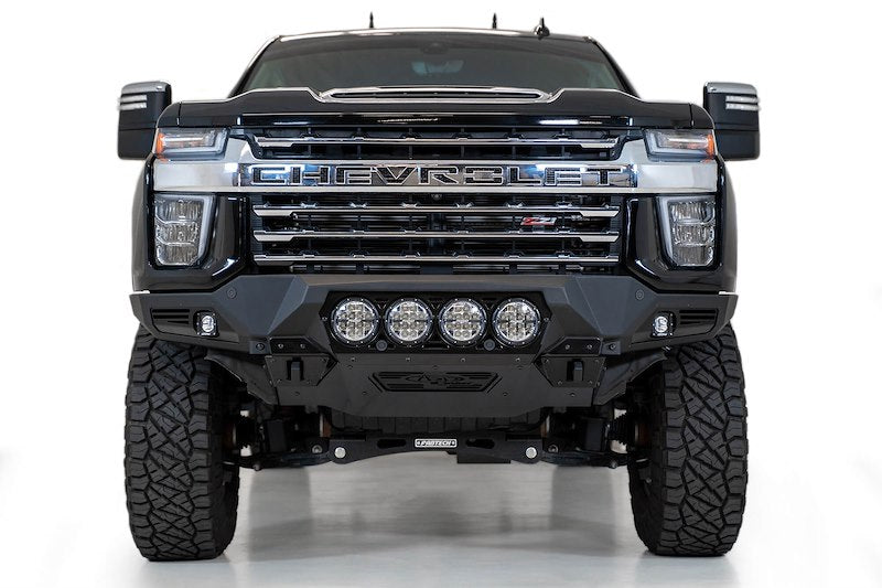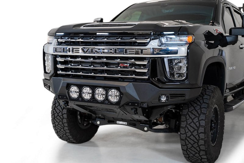 The Addictive Desert Designs Bomber Front Bumper for the 2020 and up Chevy 2500 is a slim fitting bumper. It?s made with plate steel and has full 3/16" aluminum skid plates, as well as reinforced mounts for 3/4" D-Rings.