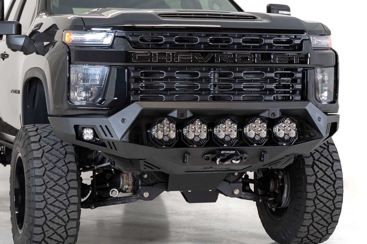 | Description_MKT | Heavy duty trucks call for heavy duty bumpers. The Chevy Silverado 2500 Bomber HD front bumper features a rugged plate steel design. A separate plate mounts your winch directly to the frame for unrivaled strength. Our reinforced clevis mounts provide a mounting point for 3/4" D-Rings for more added utility. Multiple lighting options are available, including six Rigid 360 series lights, five Baja Designs LP6 lights, or dual 40" radius light bars. One cube light can also be mounted behind each side panel. OEM parking sensors are retained. As always, this product is fully bolt-on and made in America. |