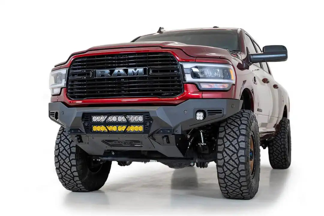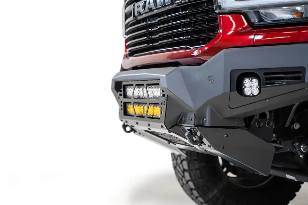 | Description_MKT | The Addictive Desert Designs Bomber Front Bumper is the slimmest fitting design for your 2020 Ram 2500. A modern plate steel design gives a clean look, while the full 3/16" aluminum skid plate saves on weight. Reinforced mounts for 3/4" D-Rings bolt straight to your frame for unrivaled strength. Three different lighting options are available: 4 Rigid 360 6" light mounts, 3 Baja Designs LP6 light mounts, or two 20" light bar mounts. Each bumper comes with two additional cube light mounts behind the side panels. As always, this bumper is fully bolt-on and made in America. |