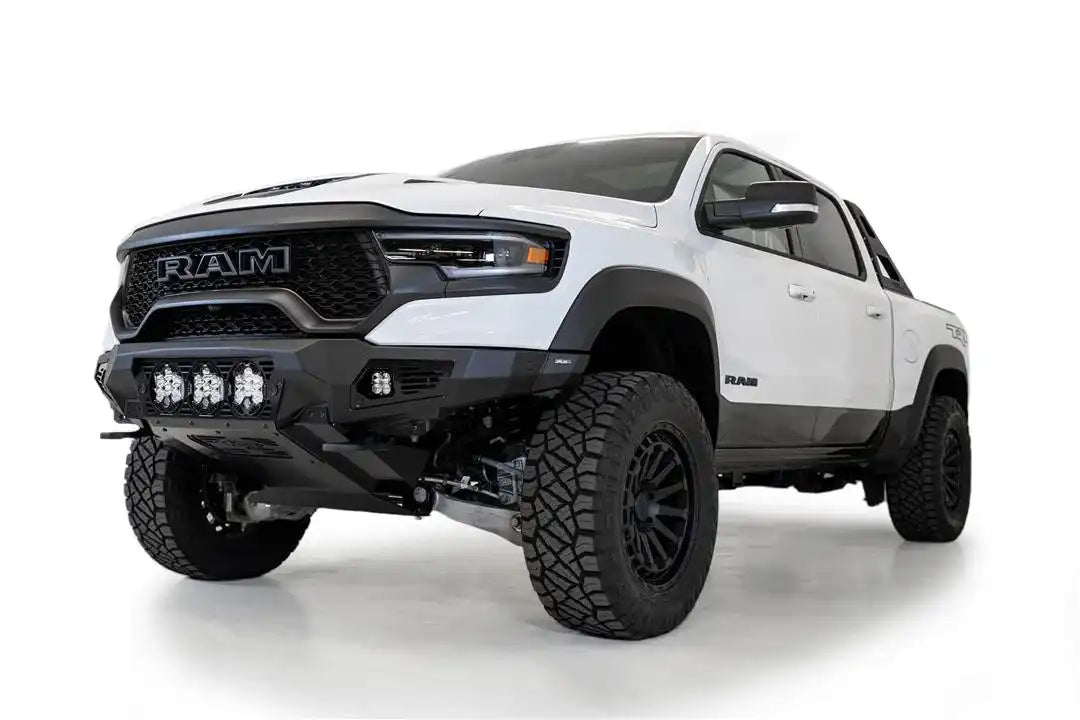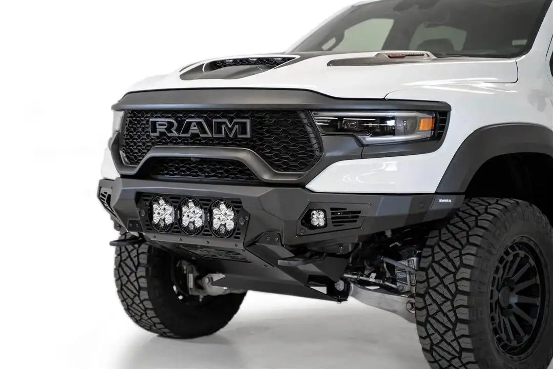| Description_MKT | Transform the front end of your Ram TRX with the Addictive Desert Designs Bomber Front Bumper. The modern plate steel design brings aggressive styling while remaining low-profile. The center of the bumper provides inset mounting points for four Rigid 360 6 inch round lights, while each side panel provides a cube light mounting point. |