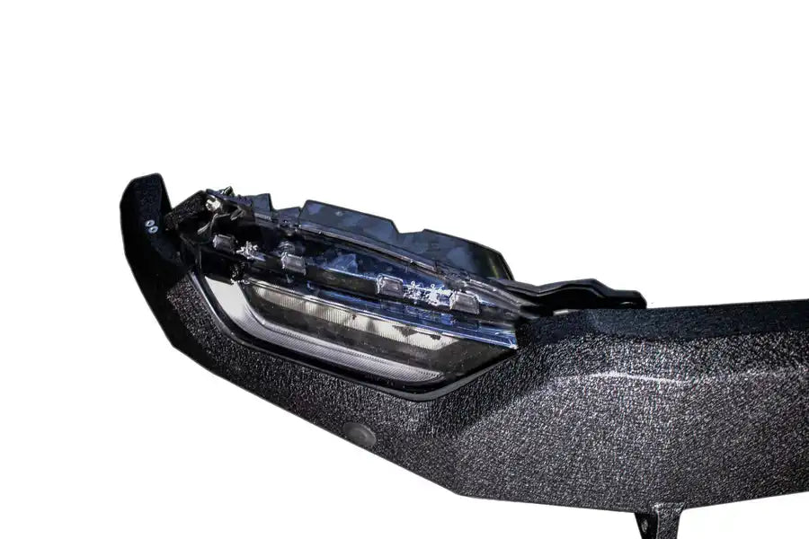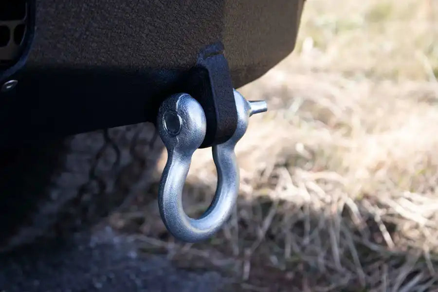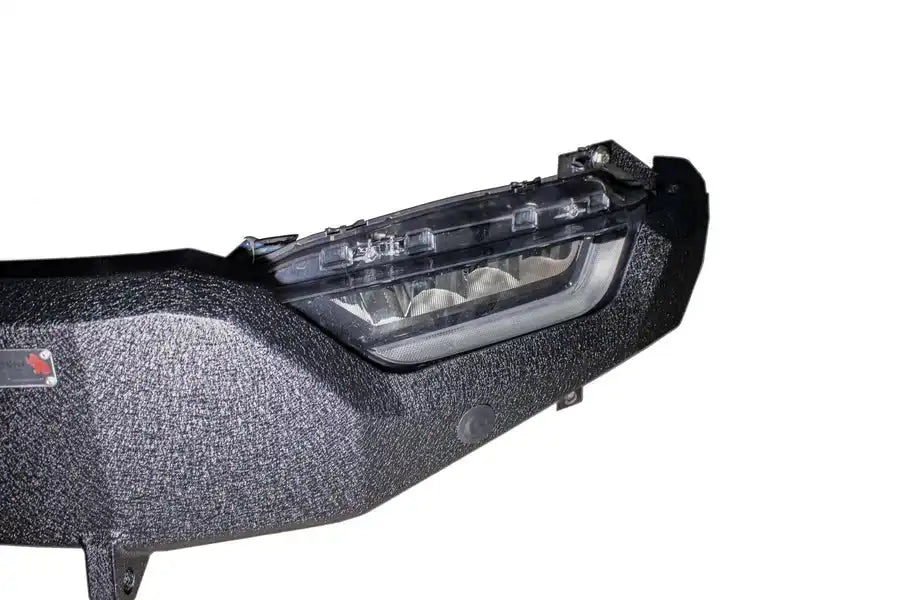 The bumper comes with welded D-ring mounts, providing an essential point for vehicle recovery. It's designed to accommodate Factory OE park sensors, ensuring no loss of this valuable feature. For trucks not equipped with these sensors, the bumper includes handy plugs to maintain a sleek appearance. The bumper also allows for the integration of factory fog lights, ensuring you don't lose any of the functionality you value. While it's ready to support a winch for those who need it, the winch plate is available as a separate purchase, under part number FB22393.