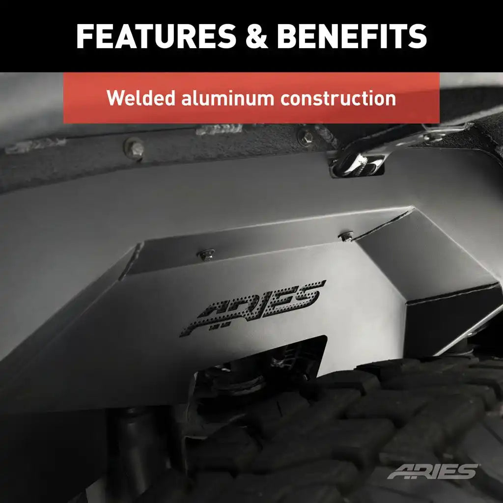 ARIES Jeep inner fender liners are the perfect accessory for the offroading Jeep Gladiator JT. These trail-ready fender liners feature a highly rust-resistant construction, an integrated design for maximum protection and a tough, aftermarket look. They are available for the front and rear and they are the perfect complement to our offroad-style aluminum fender flares. This package includes two fender liners for the rear, one for the driver side and one for the passenger side. ARIES Jeep inner fender liners begin with an all-aluminum construction. Unlike plastic liners, aluminum fender liners offer enhanced strength to resist the barrage of offroad elements, including sticks, gravel, mud, snow, sand and much more. Also unlike steel fender liners, ARIES aluminum fender liners will not rust. To maximize corrosion resistance and durability, we cover them in a tough carbide black powder coat finish. This not only protects against rust, but it also helps withstand the inevitable scuffs and scratches accumulated on the trail. ARIES Jeep fender liners are not only built to outlast the rigors of offroading, but they are also engineered to offer enhanced protection for the engine. The front fender liners integrate with the wheel wells and create a shield for the engine compartment, helping to block water, mud, road salt, gravel and other threats. The powder-coated aluminum construction provides increased protection versus the plastic factory liners and it maintains long-lasting corrosion resistance. For a custom fit on the Jeep Gladiator JT, ARIES Jeep fender liners feature a vehicle-specific installation. They are designed to replace the existing factory fender liners and contour to the body of the Wrangler, offering an aggressive, aftermarket look. Both the front and rear fender liners are also designed to be installed together with ARIES fender flares. Together, they provide enhanced protection on the trail and better compatibility with offroad tires.