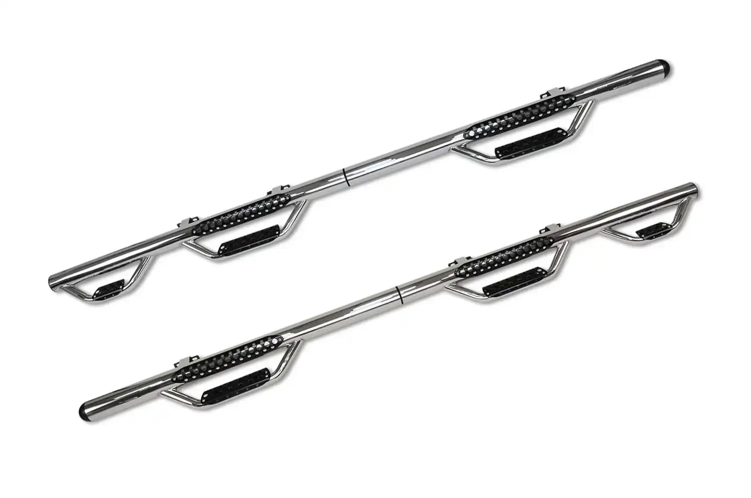 Dominator hoops now feature a wider and more slip resistant step pad. Punched steel step pads offer extra grip. Quick and easy one person install. Wheel to wheel SideSteps. 3" round tubing. Third hoop provides access to bed or toolbox. Will ship UPS. Textured black powder coat coat with a 5 year warranty. U.S. Patent No. 6,588,783 - 6,874,801 and other patents pending.