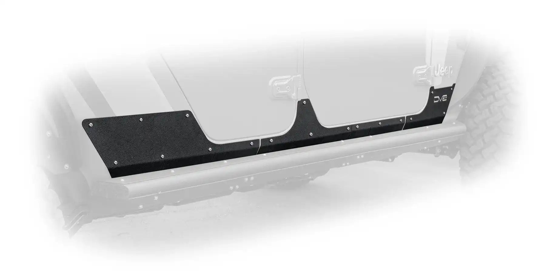 The DV8 Offroad SRGL-05 Rock Skins can be used with any Gladiator step or slider and contour around either factory or aftermarket fenders. They are designed to add protection to the exposed are of the body between the door and the bottom of the body which is one of the most susceptible areas on any Jeep for trail damage. The SRGL-05 come complete with stainless steel hardware and attach to the Jeep using nutserts. Key Features: Made with 3/16 inch steel, Powdercoated DV8 Textured Black, Protect a very vulnerable area of the Gladiator, Can be used to cover trail damage, Attach securely using nutserts.