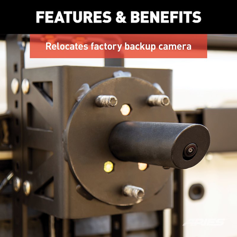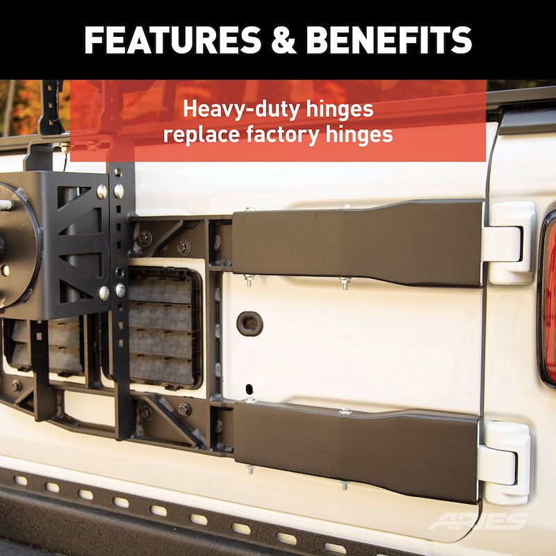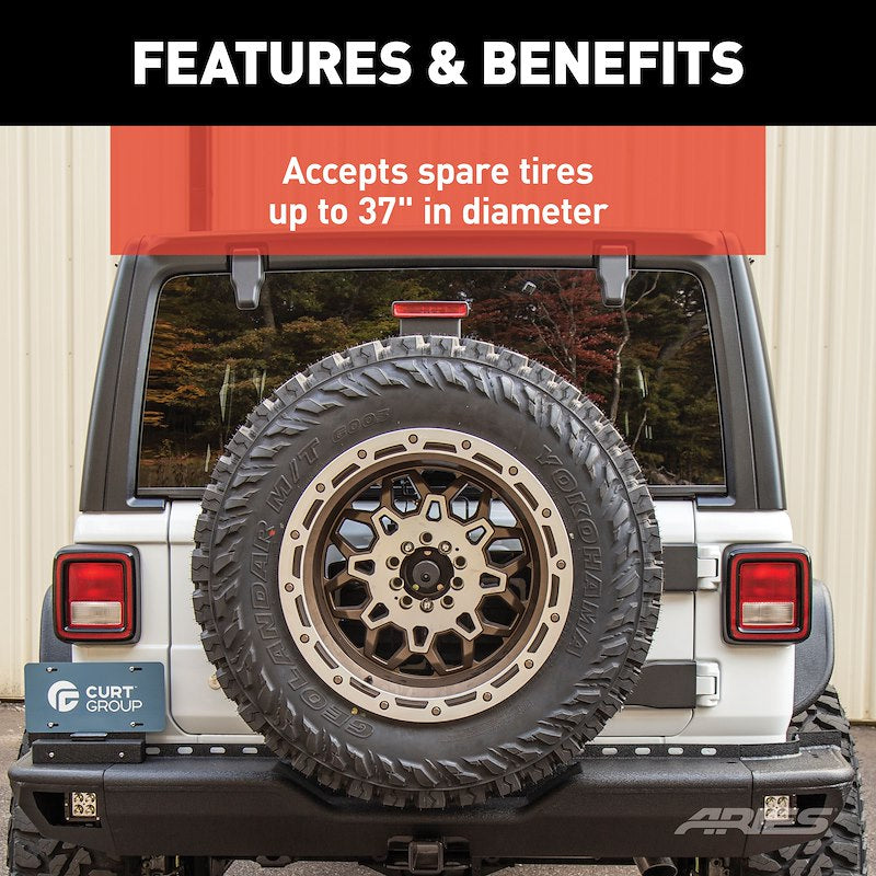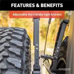An extreme off-roading Jeep needs extreme accessories, and the ARIES heavy-duty spare tire carrier for the Jeep Wrangler JL couldn’t be more perfect for the job. This HD rear door carrier is designed to be highly adjustable and unbeatably beefy, giving you the freedom to mount oversize spare tires up to 37" in diameter. The Jeep heavy-duty tire carrier is adjustable in two ways. First, the tire mount can be adjusted both vertically and horizontally. The vertical adjustment provides increased clearance for extra-large tires, eliminating bumper interference problems and allowing for up 37" spare tires to be mounted on the carrier. The horizontal function moves the tire mount toward or away from the vehicle, ensuring clearance with the rear door. The second way the HD spare tire carrier is adjustable is in its third brake light bracket. The bracket can be moved up and down as needed. This allows you to maintain safety on and off the road by always keeping the third brake light fully visible, no matter how large the spare tire gets. To give the ARIES spare tire carrier adequate strength to hold large off-road tires, it securely attaches to the existing Jeep JL door hinges. The carrier itself installs with no drilling required, utilizing the existing factory mounting points. The HD Jeep Wrangler tire carrier is also constructed from welded steel for maximum strength, and it features a highly durable, dual-layer E-coat and carbide black powder coat finish for superior rust resistance.