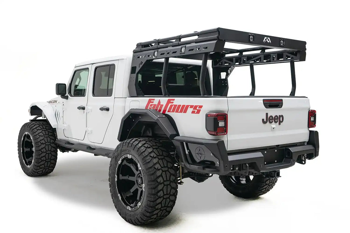 | Description_MKT | The perfect combination of form and function. The Fab Fours' Overland Rack for the Jeep Gladiator was made for the ultimate adventurous spirit. Key features include multiple mounting points; multiple tie down points; integrated pod mounts; expandable design (with optional front rack. Coming soon); ability to make solid floor by purchasing extra cross member (sold separately), Integrated roof access step; Ease of Installation, 12 GA Steel construction. Manage your cargo with ease with this adaptable and expandable overland rack. Always Made in the USA! |