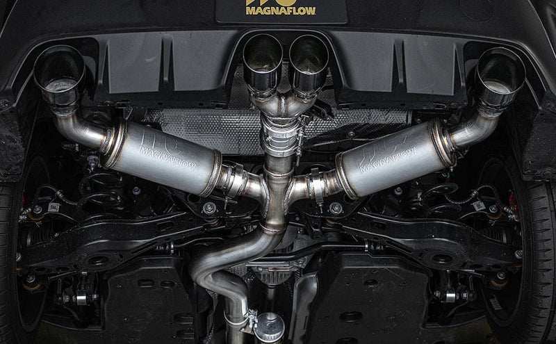 The MagnaFlow Toyota GR Corolla NEO Series Cat-Back Performance Exhaust System #19631 turns your ultimate sporty compact into a JDM-like beast that stays at the head of the pack thanks to its modern take on MagnaFlow's signature sound and renowned dyno-proven power gains. This 2023 GR Corolla exhaust kit represents an all-around performance improvement for your GR's 1.6L without compromises, even going so far as to retain your OEM vehicle's factory controllable exhaust valve option using MagnaFlow's own stainless steel valves. Additionally, #19631 seamlessly integrates MagnaFlow's No Drone Technology (NDT) to ensure optimal driver enjoyment, free of any unwanted droning noises that can otherwise occur at cruising speeds. Exhaust kit #19631 features 3 in. mandrel bent main piping that passes through an 11 in. NDT tuned chamber, smooth Y-pipe transition, and two 11 in. straight-through performance mufflers before terminating in a quad-center split rear exit with 4.5 in. outer and 3.375 in. inner tips featuring a double wall, angle-cut logo etched design with a black chrome finish. This performance exhaust features an easy-to-install, direct-fit design that is engineered to replace all OEM exhaust components from near the catalytic converter on the back. #19631 is made of durable, corrosion-resistant stainless steel and produced using advanced CNC precision robotic manufacturing techniques, all backed by MagnaFlow's limited lifetime warranty.