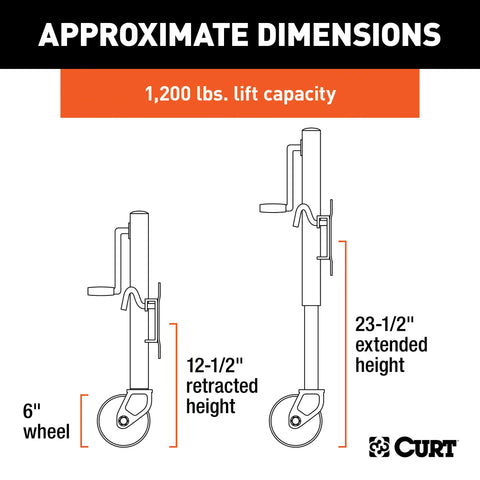 In our goal of being your best source for all things towing, the CURT line of trailer jacks is designed with care and manufactured with pride. CURT jacks are made with quality to promote the life and function of your trailer, and they come in several different styles to accommodate your needs, whether you are a frequenter of the boat landing, the campground, the racetrack or the field. Designed to withstand the wear and tear of frequent water exposure, CURT marine jacks are the jack of choice for the avid fisherman or boating enthusiast. Our marine jacks have a few features that make them a special addition to our trailer jack line. Unlike any of our other jacks, CURT marine trailer jacks are equipped with wheels, allowing for greater mobility and easier coupling of your trailer. Choose from models with one or two wheels. Marine jacks also have a heavy-duty pull-pin that allows them to pivot on their mounting bracket to be out of the way for travel. To protect them from corrosion and the damage of moisture, these jacks come with a zinc finish. This CURT marine jack features a weight capacity of 1,200 lbs., a travel of 10" and a wheel diameter of 6". It comes with a side-wind handle and all the necessary bolt-on hardware for a complete installation. It does not matter what kind of trailer you tow -- a boat trailer, utility trailer, livestock hauler or recreational vehicle trailer -- if you have a receiver-style trailer, you will want a jack that complements its function. For a trailer jack that will not steer you wrong, CURT has the answer.