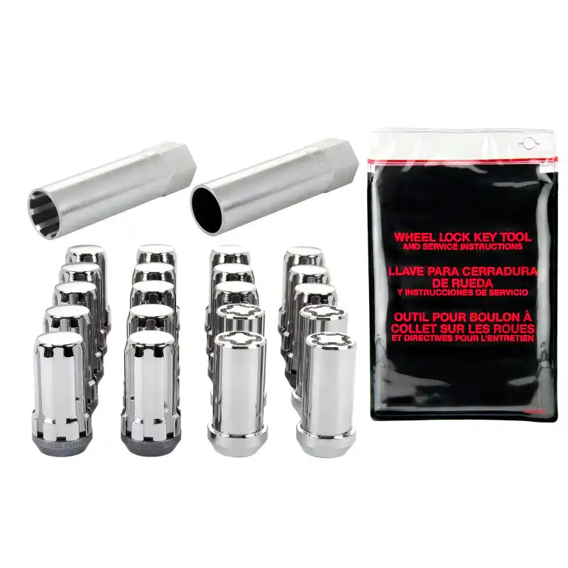 Chrome SplineDrive 5 Lug Wheel Installation Kit (M14 x 1.5 Thread Size); Set of 16 Lug Nuts, 1 Installation Tool, 4 Wheel Locks, 1 key & Key Storage Pouch,