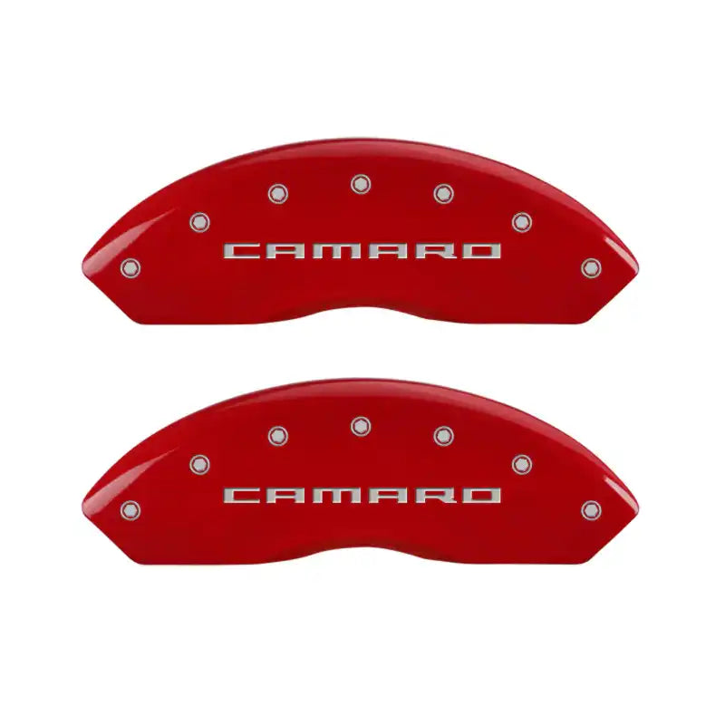 Set of 4 caliper covers, Engraved Front and Rear: Gen 5/6 Camaro, Red powder coat finish, silver characters.