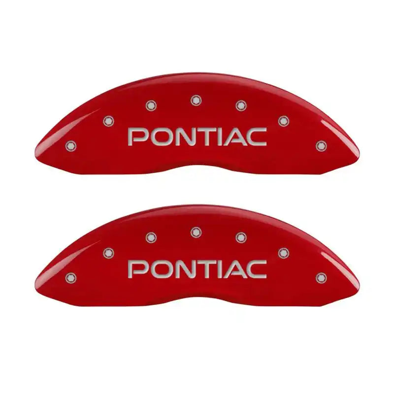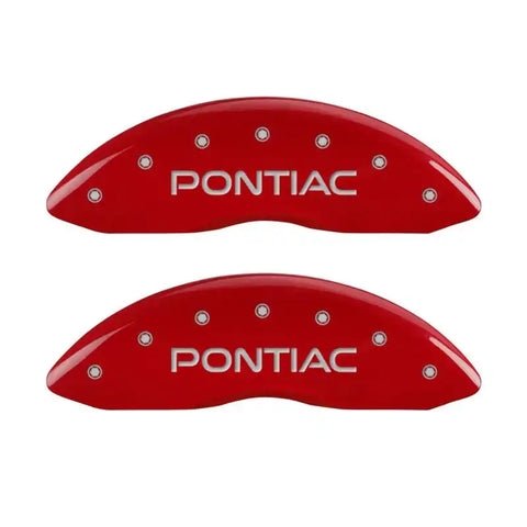 Set of 4 caliper covers, Engraved Front and Rear: Pontiac, Red powder coat finish, silver characters.