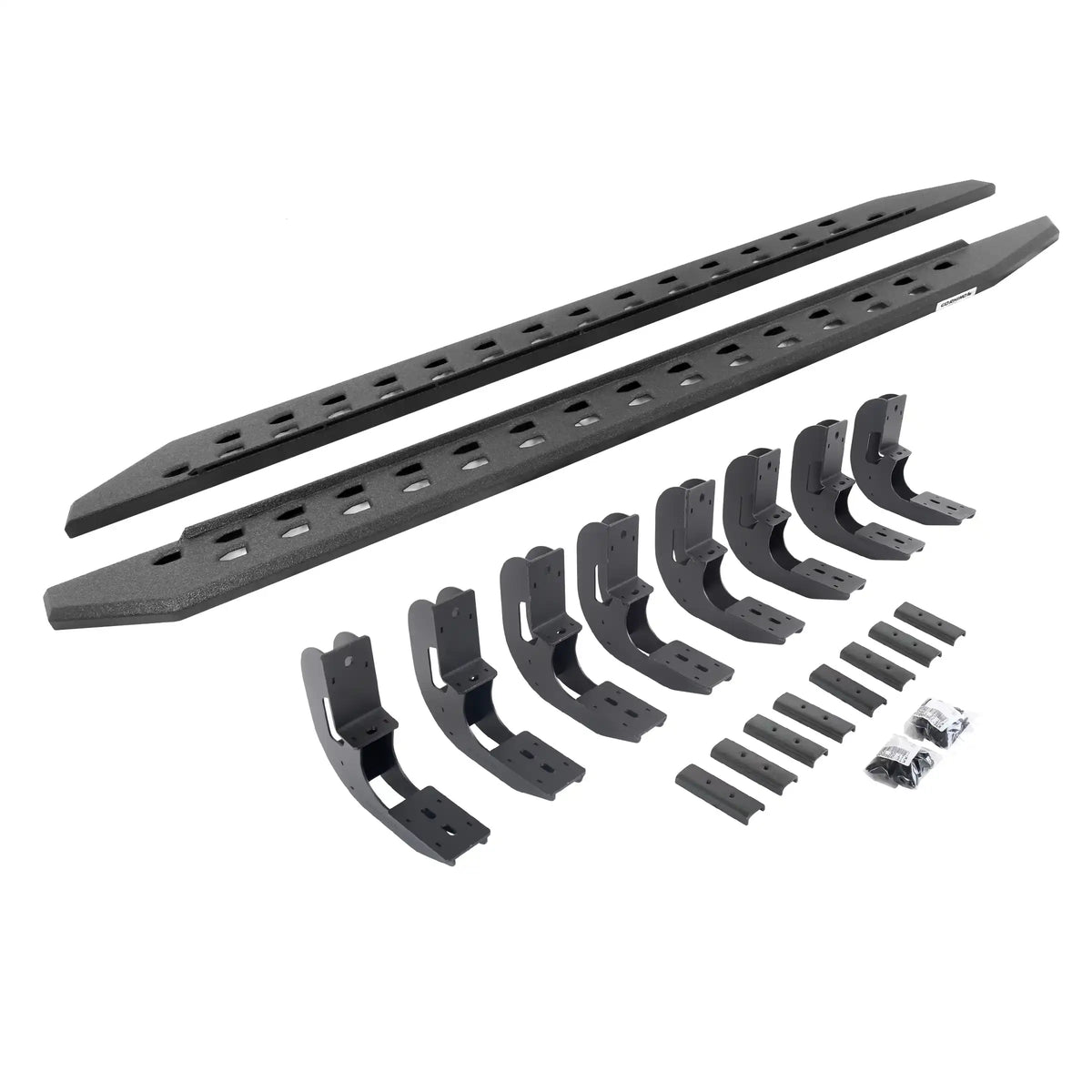 The RB20 Slim Line Running Boards offer the same heavy duty toughness as the original RB Series, but with a slimmer design that fits tighter along the cab for increased ground clearance when off-roading. Constructed from 16-gauge zinc-coated galvanized steel, the Raptor-inspired boards were built to protect your panels from flying debris while providing a full-length step platform. The modern, bullet-stamped design is 5 1/2 inches across at its widest point (compared with 7 1/2 inches of the original RB20) and are offered in cab-length sizes that fit most popular trucks, Jeeps and SUVs. The RB20 Slim Line come with a Limited Lifetime warranty on materials and construction and a 5 year warranty on the Textured Black Finish.