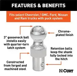 Outfitting your pickup to tow a heavy-duty flatbed or livestock trailer is easy with the CURT OEM puck system gooseneck ball. Like our OEM puck system safety chain anchors, this 30K gooseneck ball utilizes the puck system built into certain pickup trucks today with the towing prep package. It features a patented installation system, operating with a simple quarter-turn latch lock for ease of use and a secure mount. Retention balls, built into the shank, keep the gooseneck ball fixed into the receiver hole and keep your trailer locked on tight. It provides a ball diameter of 3" and has a gross trailer weight capacity of 30,000 lbs. It also comes with a durable chrome finish and meets U.S. V-19 specifications for safety. This particular OEM puck system gooseneck ball is compatible with Chevrolet, Ford, GMC, Nissan Titan XD and Ram pickups with the truck bed puck system. It is not designed to fit any other gooseneck ball holes.