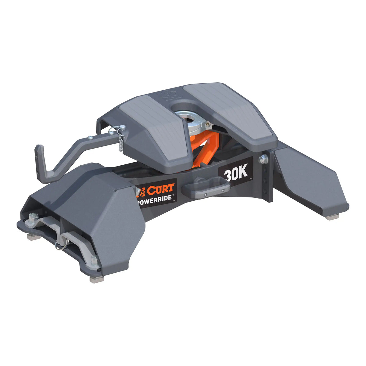 The CURT PowerRide 5th wheel hitch equips your pickup truck with a profession-grade solution for 5th wheel towing. It features a fully tested 30K rating, a cast head with multi-directional tilt, an easy-to-use self-resetting handle, enhanced portability and no welding or fabricating required for installation. This CURT 5th wheel hitch offers exceptional towing power with its 30K gross trailer weight rating and 7,500-pound vertical load limit. It is constructed with a cast steel main body for dependable strength, and it is thoroughly tested to SAE J2638 specs for safety. It's ideal for towing the largest RV trailers, camper motorhomes and other 5th wheel trailers. The PowerRide 5th wheel trailer hitch also features a cast yoke head that tilts in multiple directions -- not just forward and backward -- to promote a smooth ride. PowerRide is very easy to operate. It is engineered with a self-resetting handle, a simple mechanism that resets the jaws to the ready-to-couple position after uncoupling, saving you an extra step in the hookup process. The handle is easy to reach and operate from the side of the truck, and the hitch is also equipped with a three-position coupling indicator to further streamline the process. For installation and removal, PowerRide is unique with a one-pin head removal system. The central pin can be removed as needed, breaking the hitch down into smaller, easier-to-lift pieces. Strategically placed grips also offer a comfortable handhold. The CURT PowerRide 5th wheel hitch installs without any welding or fabricating required. This model comes with a set of CURT OEM puck system 5th wheel legs designed to be mounted on select models of the Ford F-250 Super Duty, F-350 Super Duty and F-450 Super Duty with 8-foot bed and with the truck bed puck system (year range specific). The legs mount directly into the four-point mounting system, allowing the hitch to be installed quickly and easily. This kit comes with the hitch head and puck system legs.