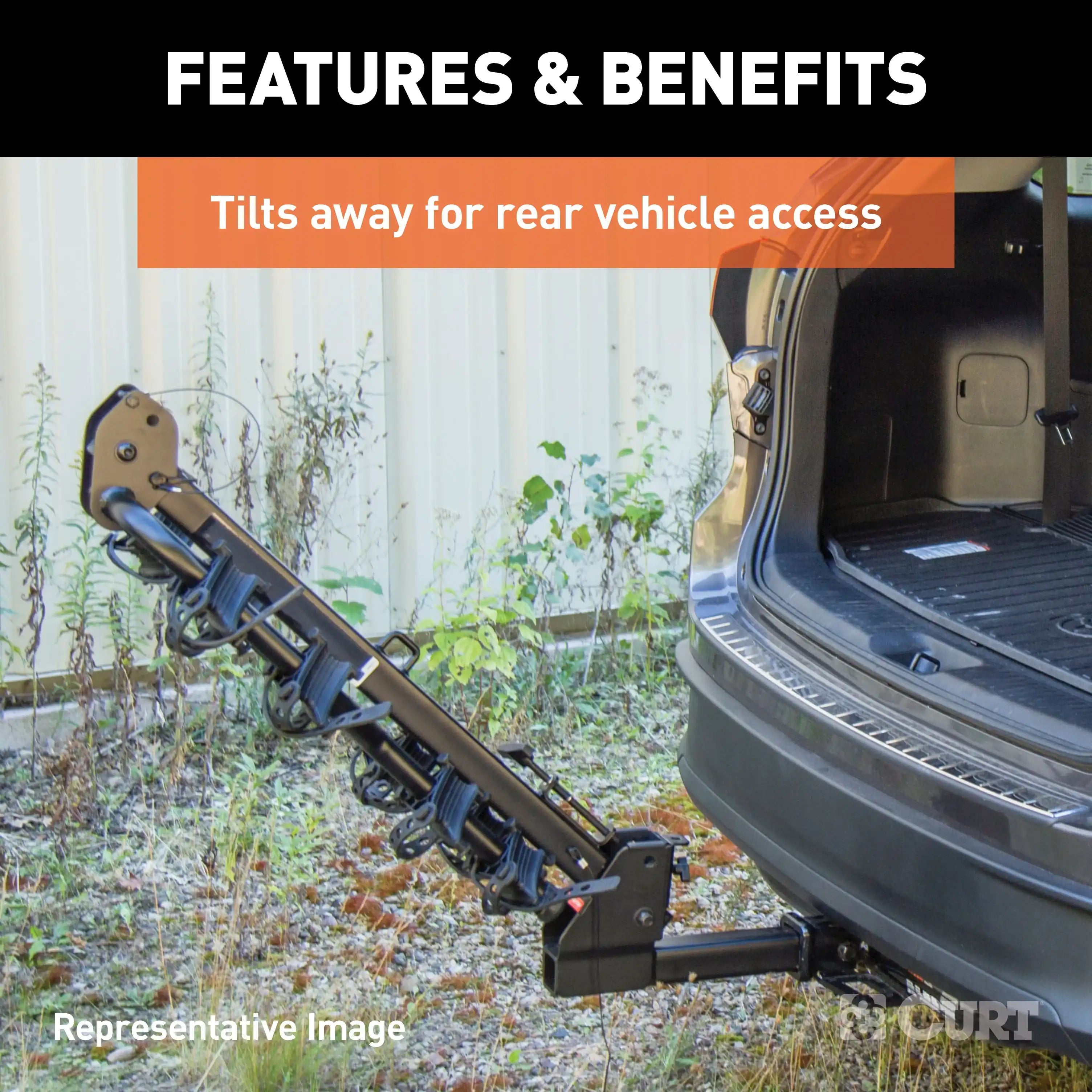 Whether you are an avid mountain biker or a casual rider, you will want CURT along for the ride. CURT bike racks offer both versatility and quality and are available in several different styles to fit your needs. CURT premium bike racks come with an anti-wobble shank for better bike security, foldable arms for a compact design and a tilt-away feature for easy rear vehicle access. One feature that sets the premium bike rack apart from others is its tapered arm design. CURT premium bike racks are very accommodating to different types of bikes, having tapered arms to fit a range of bike sizes. This makes them an especially attractive option for families with younger children. All CURT premium bike rack comes with a durable powder coat finish, built-in reflectors and non-scratch rubber cradles. This model features a maximum load limit of 225 lbs. and is able to hold up to five bikes at a time. NOTE: For use with any frame-mounted 2" class 3 or higher trailer hitch receiver. Clamp-on bumper receivers and traditional 4" square bumpers should not be used to mount bike racks. Do not exceed receiver weight limits.