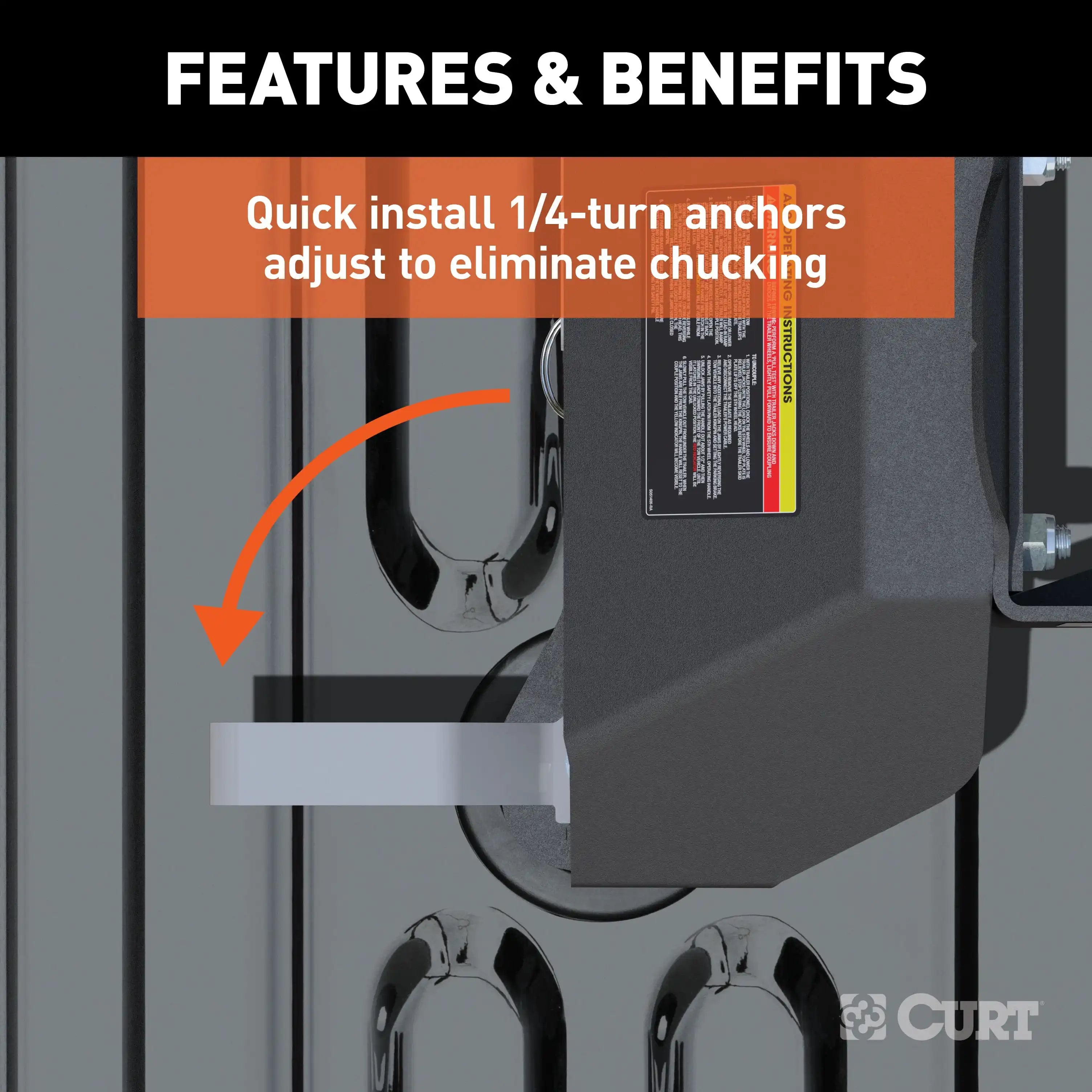 CURT OEM puck system 5th wheel legs allow for faster, easier and more secure installation of your CURT 5th wheel hitch. They utilize the truck bed mounting platform, called the puck system, built into certain pickups today with the towing prep package. Using a set of anchors, the legs quickly and easily drop into the pucks, instantly equipping the truck for 5th wheel towing. This set of 5th wheel legs is designed to fit the puck system in select model years of the Ford F-250, F-350 and F-450 Super Duty with 8-foot bed (see application info to verify fitment). With a gross trailer weight capacity of 24,000 lbs., the legs are compatible with most CURT 5th wheel hitches (weight capacities are limited to the lowest-rated towing component). The most unique feature of CURT OEM puck system 5th wheel legs is their quarter-turn anchoring system. This system is the key to streamlined 5th wheel towing. With the hitch head initially bolted onto the legs, the legs can quickly be installed or removed from the truck bed as needed, simply by turning the anchor handles. The quarter-turn anchors supply the necessary strength for towing heavy-duty 5th wheel trailers, and they feature an adjustable design to perfectly lock the hitch into place and eliminate any chucking noises. To give you confidence in every job you undertake with your truck, we give our OEM puck system 5th wheel legs a durable carbide black powder coat finish. This makes them highly resistant to scratches, rust and UV damage. We also back our 5th wheel legs with a limited lifetime warranty to put your mind at ease with every new mile.