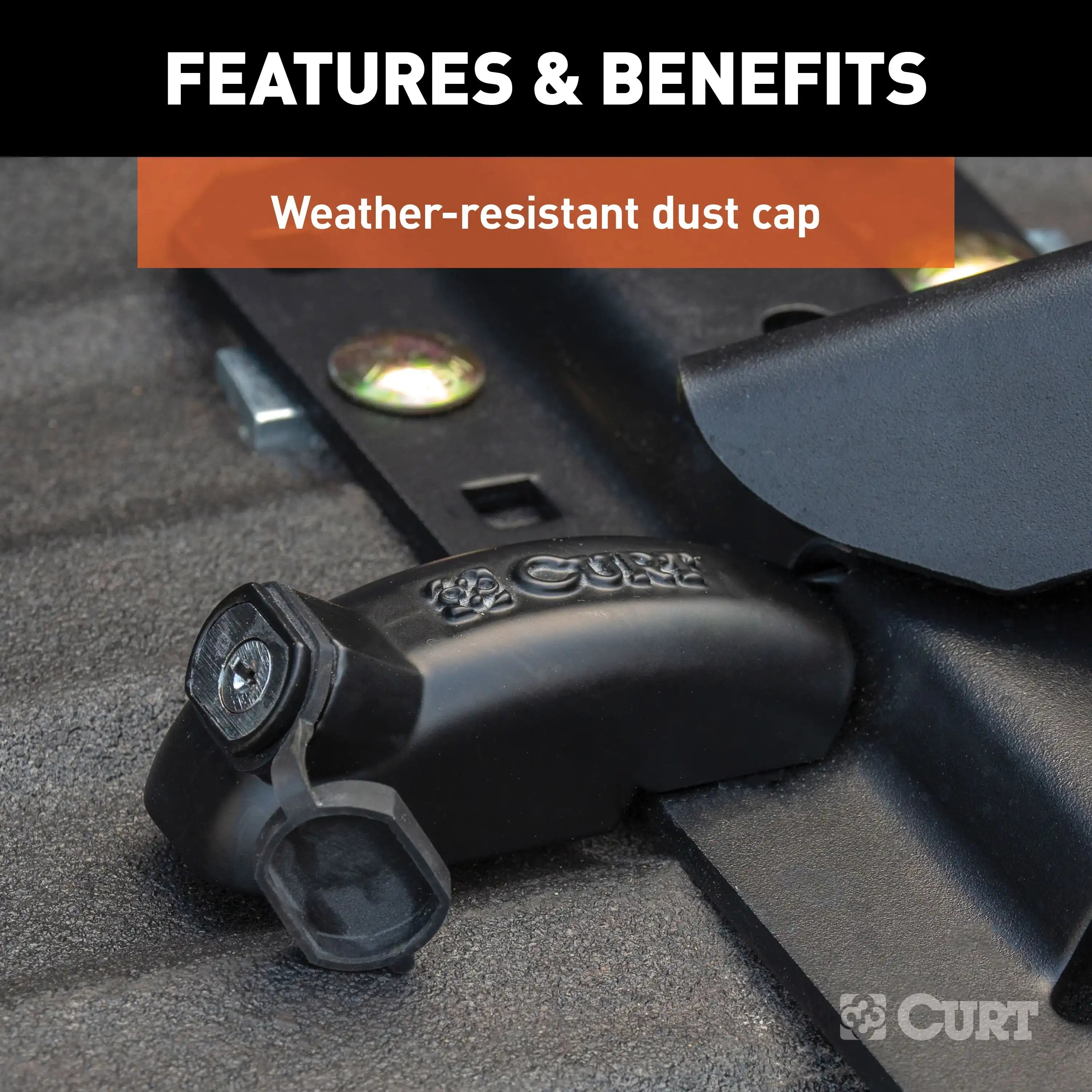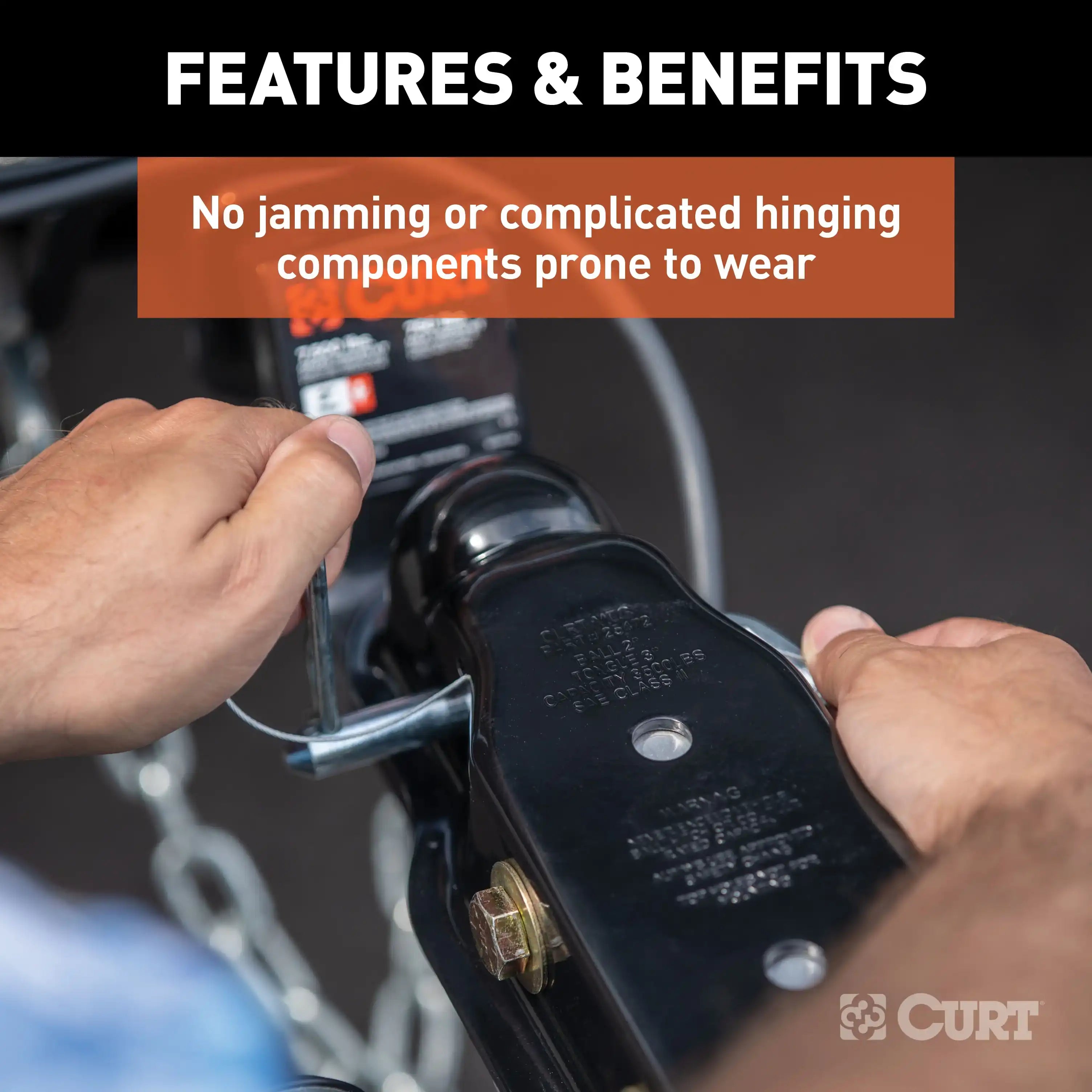 The CURT QuickPin trailer coupler is a revolutionary coupler design, doing away with the traditional latch mechanism for simple, stress-free trailer hookup. Most couplers use a complicated hinging latch that's prone to wear out and become corroded, leading to difficulties and frustration. Instead of a latch, QuickPin uses a simple hitch pin to create a safe, reliable, hassle-free towing connection. It's as easy as dropping the trailer tongue onto the hitch ball, inserting the QuickPin hitch pin, and that's it! No more wrestling with a rusty latch, and no adjustment or tightening needed. This trailer hitch coupler is fully tested according to SAE J684 specifications. It is rated for 3,500 pounds and fits any standard 2-inch diameter trailer ball. The coupler channel can be mounted on a 3-inch wide trailer tongue beam, featuring standard mounting holes to fit most existing bolt patterns (mounting hardware not included). It is also finished in a durable black powder coating for lasting rust resistance. NOTE: This coupler comes with a 1/2-inch pin that must be used when connecting the trailer. It may not be replaced with a different 1/2-inch pin.