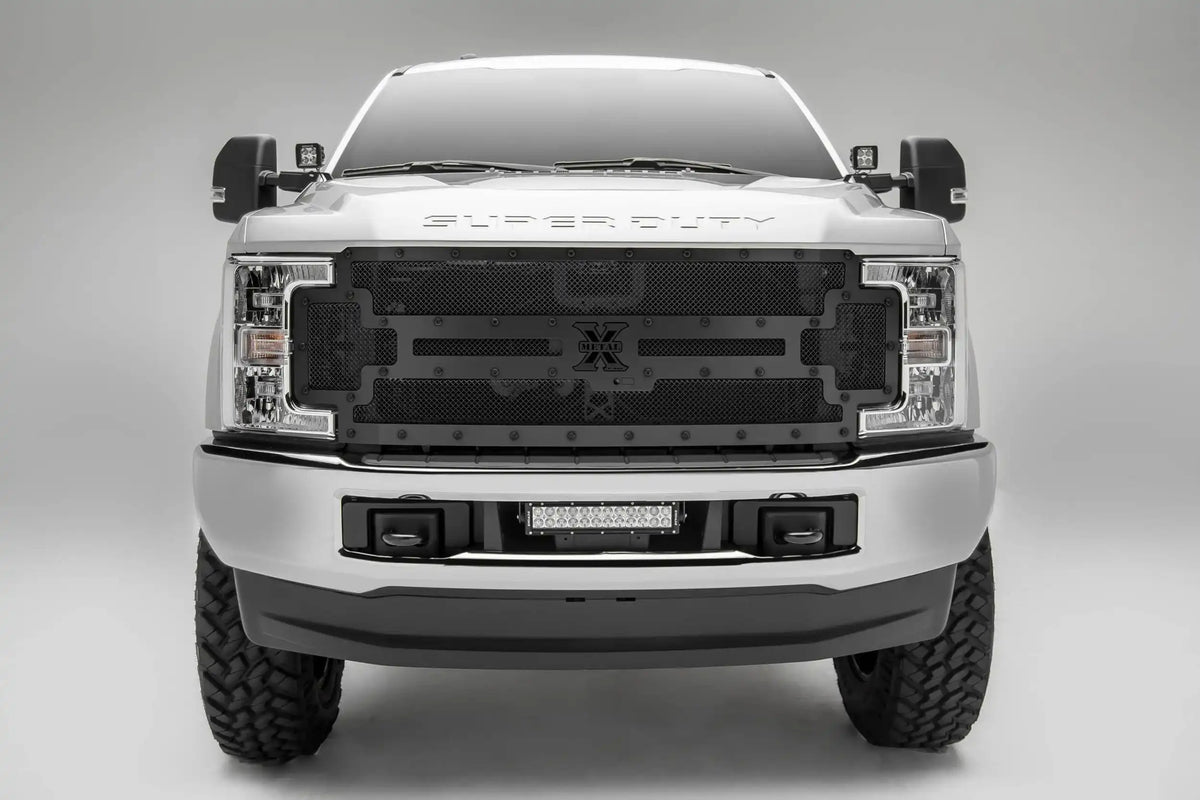 Stealth X-Metal Grilles are designed for the extreme truck and SUV enthusiast looking to make a bold statement with a blacked-out grille. Stealth X-Metal Series Grilles feature an aggressively studded perimeter surrounding the formed heavy gauge mesh. Each stud is embedded with X-Metal branding and every grille includes our patented X-Metal logo. This unique grille is made of mild steel and comes with black studs and black powdercoat finish, most X-Metal Grilles are also available with polished finish and chrome studs (X-Metal Series). Our uncompromising quality begins with advanced 3D CAD supported engineering and design. All our products undergo rigorous testing for fit, finish, drivability and durability. Each part starts with a custom jig using laser cut materials, precision TIG welding and meticulous assembly and quality control. This dedication of American craftsmanship shows in every product that leaves our facility in California. All our black powder coated grilles go through a multi-stage process, first they are sandblasted to prepare the surface for our epoxy primer base coat. Second, they are cleaned to remove contaminants from the sandblast process. Then an epoxy primer base coat is applied and cured to seal the entire surface, finally the color top coat is applied over the primer and cured to provide long lasting protection and a high-quality OEM finish.