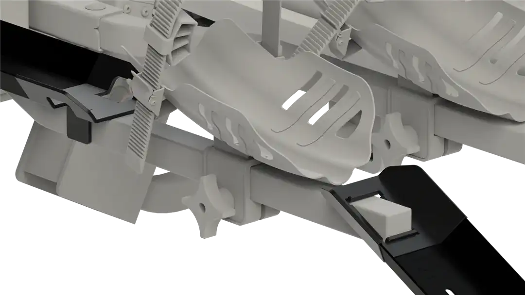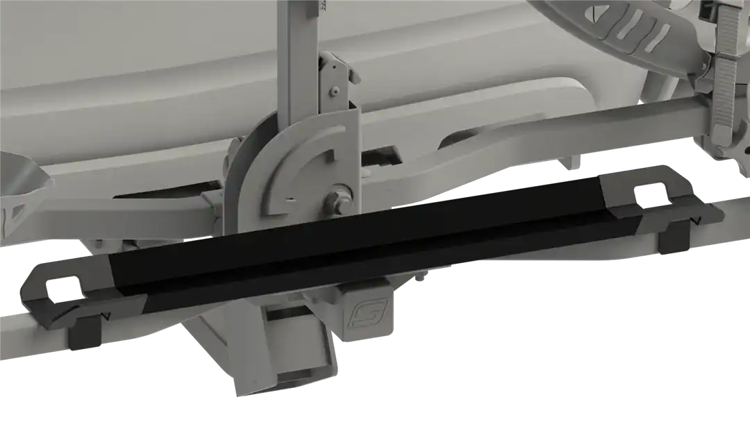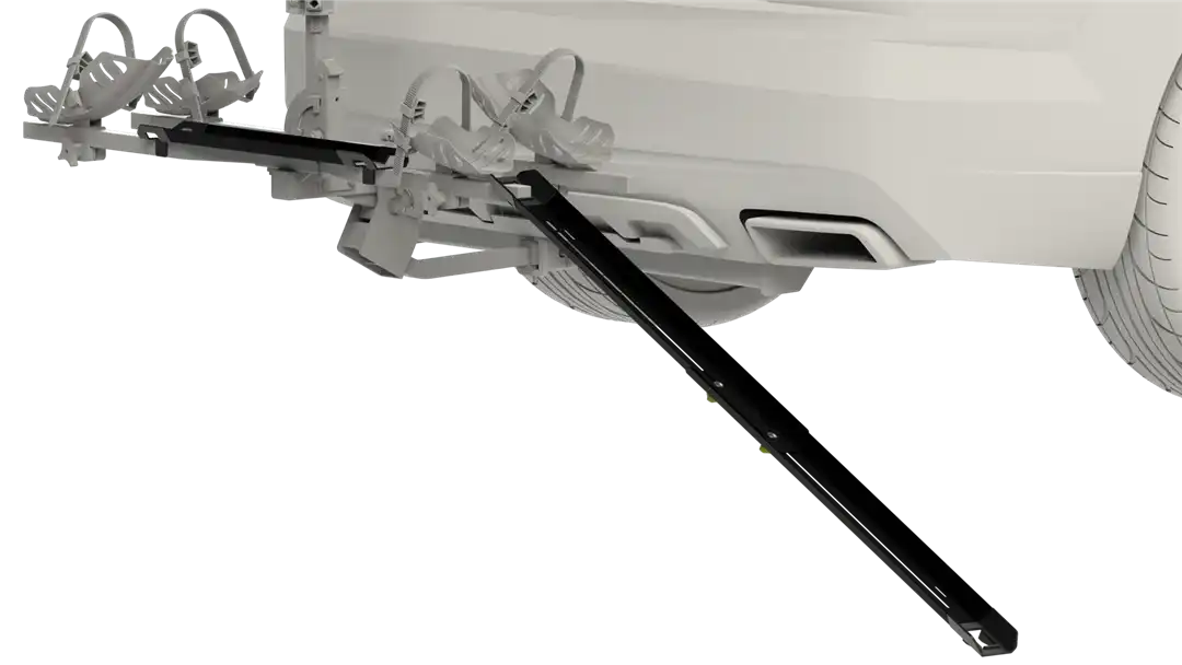 The telescoping ramp rests on the Swagman E-Spec, Current, or G10 allowing you to roll your bike up the ramp and into the wheel trays. The bridge rests between wheel trays, making it easy to finish rolling your bike into position before securing it with the ratchet arms of the bike rack.