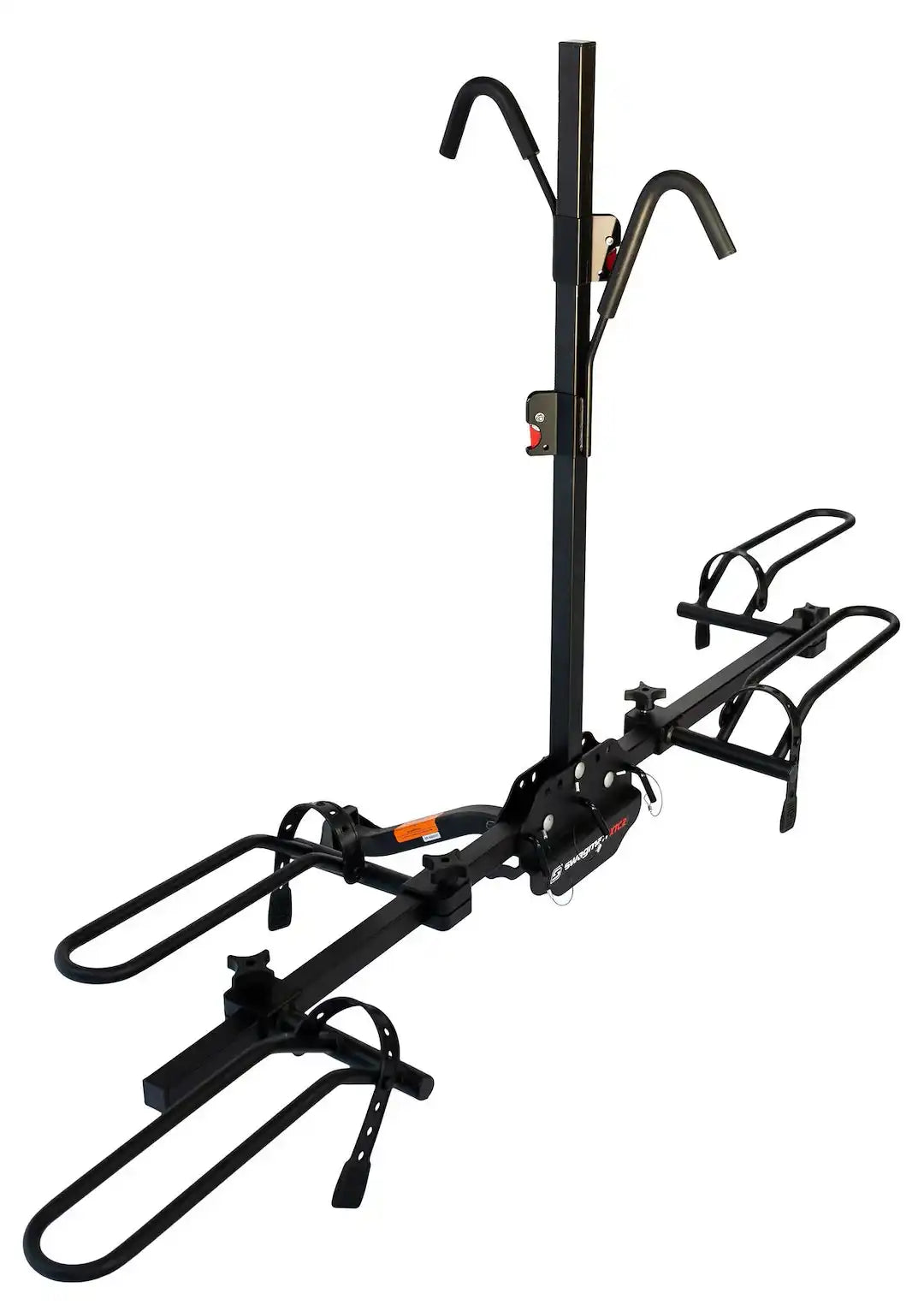 The Swagman XTC2 is a hitch mounted platform bike rack that securely carries one to two bikes. It’s a convenient and reliable way to transport your bikes to the trailhead and further afield. The center arms fold down to allow access to the rear of the vehicle and the rack folds up out of the way when not in use. The adjustable ratchet hooks safely hold the bike frame and the wheel hoops with straps secure the wheels. Fits tires up to 2.5” wide and wheels from 20” to 29” diameter.