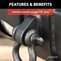The ARIES TrailCrusher Jeep bumper is constructed to outmatch every other bumper in its class. With heavy-duty, welded steel construction, it is a highly functional companion on the trail, featuring winch and shackle capabilities with a 12.5K rating. The TrailCrusher bumper is available for the front and rear, and it installs with no drilling required. Everything about the TrailCrusher Jeep bumper is designed to maximize its strength and utility. It is built with 3/16" thick all-steel plates, welded together in a stout, high-strength configuration. It also features 1/4" thick welded shoulder sleeves that add even more strength, particularly to the shackle mounts. Not only does the TrailCrusher bumper provide a 12,500-lb. winch-and-shackle rating, but it also offers excellent versatility. The winch platform of the bumper features industry-standard mounting holes to accept most types of winches, and the shackle mounts accept any pin up to 7/8" in diameter. ARIES forged steel shackles #2166071 offer a perfect fit and a work load limit to match the 12.5K rating. A number of winch accessories are also available, including a hawse fairlead #2156070, roller fairlead #2156071 and winch fairlead mount #15600FB. For added winch protection and an aggressive look on the Jeep JK, a stinger-style angular brush guard #2156050 is available. The TrailCrusher bumper is fast and easy to install, integrating with the Jeep Wrangler JK like a stock bumper. It uses pre-existing holes in the vehicle frame to eliminate drilling from the install process, and it mounts with 3/8" steel brackets for added strength. To be ready for whatever the trail has in store, both the front and rear ARIES one-piece bumpers come an E-coat and carbide black powder-coated finish, maximizing rust and scratch resistance. Each comes with all necessary mounting hardware for a complete installation and is covered by a three-year warranty.