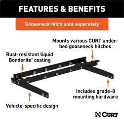 Choosing the right gooseneck hitch is only half the battle in preparing your pickup truck for towing a gooseneck trailer. CURT gooseneck hitches are a premium option in the heavy-duty towing industry, but they are only one of the members in the heavyweight tag team that is CURT gooseneck towing. While a gooseneck hitch gets all the glory above the floor of your truck bed, gooseneck installation brackets provide sure footing and a solid foundation for that oversized gooseneck trailer. Gooseneck installation brackets work by bolting onto the frame of your truck, typically using pre-existing holes. With a set of brackets firmly bolted on, a gooseneck hitch is able to be attached and is given the strength it needs to manage the massive amount of weight of a gooseneck trailer. With so many gooseneck hitch options available from CURT, we wanted to make sure we offered the gooseneck installation products needed to give you a complete towing package. Our installation brackets fit multiple vehicles and hitch heads. This particular set of gooseneck installation brackets is able to work with CURT Double Lock and Quick Goose II gooseneck hitches. It is rated to the vehicle's maximum gross trailer weight capacity and provides a custom fit for certain years of the Dodge Ram 1500, 2500 or 3500 (see application info to verify fitment). With each set of CURT gooseneck installation brackets, we provide the necessary hardware for an easier installation, and we coat our gooseneck brackets in a liquid A-coat to make sure rust and other potential damages are not a problem.
