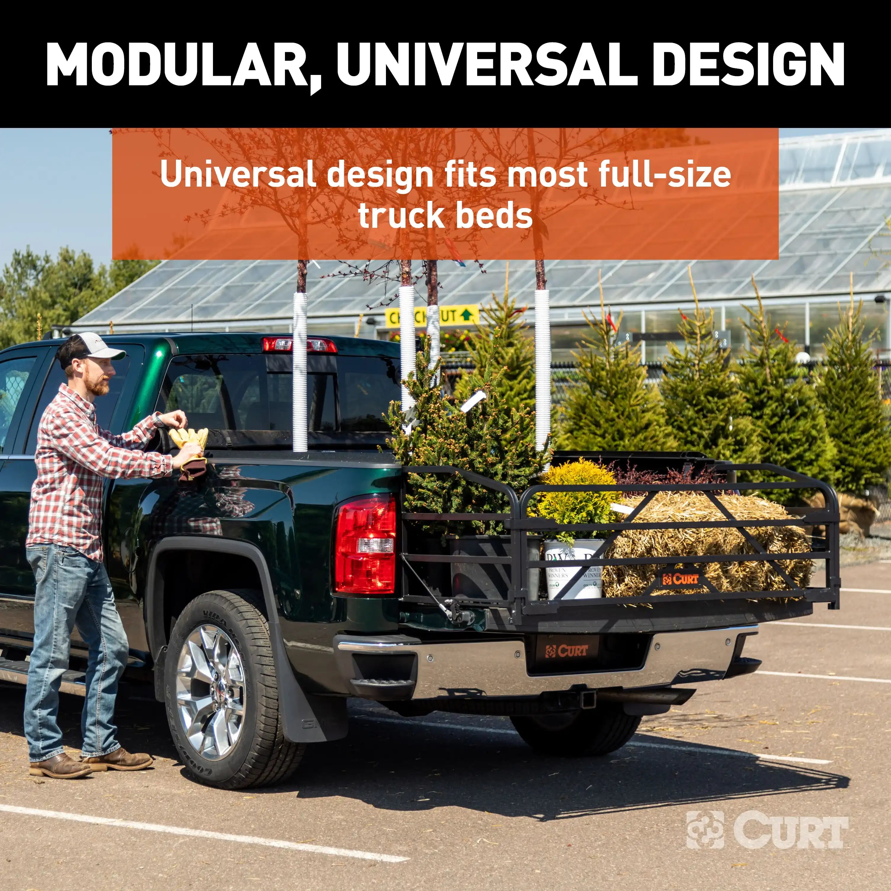 The CURT universal truck bed extender offers several innovative advantages to make the most of your truck bed. First, its pin-latch system eliminates the need to drill into your truck bed or modify it in any way. Instead of bolting into place, it installs quickly and easily, using the pin-latch system. Next, the CURT truck tailgate extender is unique because of its integrated fold-down tailgate. It provides convenient, more ergonomic access to your truck bed and cargo, unlike models that flip up or require you to climb over or uninstall completely. The CURT truck bed extender also features squared off corners to maximize storage space, unlike rounded models. It adds 26-1/2 inches of length to your truck bed, turning 6-1/2-foot beds into 8-1/2-foot and 8-foot beds into over 10-foot. It fits most full-size truck beds, including short and long options. It is constructed from strong, powder-coated steel tubing but only weighs 40 pounds, making it even easier to install or remove as desired. The entire truck bed extension breaks down into three panels for compact storage.