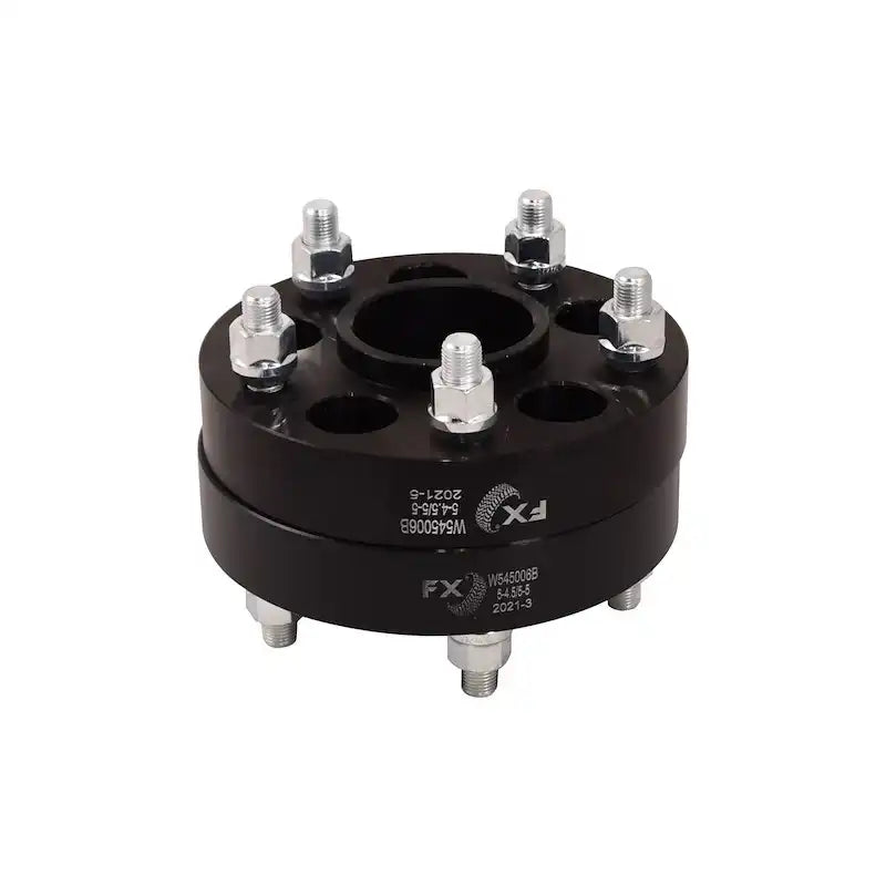 Wheel Adapter; FX Wheel Adapter; 5 x 114.3 Millimeter/ 5 x 4.50 Inch Axle Bolt Circle; 5 x 127 Millimeter/ 5 x 5.00 Inch Wheel Bolt Circle; 1/2 x 20 Thread Size Studs; 1-1/4 Inch Thickness; Black; Aluminum 6061-T6; 10 Set Of Bolts And Nuts; Hub Centric