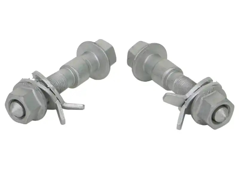 Whiteline 15mm camber bolts provide the largest adjustment range of up to +/- 0.75deg Unlike other "friction" lock designs we use a positive toothed lock washer which means NO SLIP. Simple to adjust and lock time after time with out slipping.